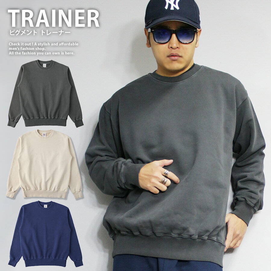 ピグメント トレーナー メンズ ピグメントスウェット 顔料染め スウェット 裏毛 裏パイル OE糸 オープンエンド糸 綿100 コットン ヘビーウェイト 10oz クルーネック 黒 ブラック ユーズド加工 ヴィンテージ風 シャリ感 吸汗性 毛玉防止