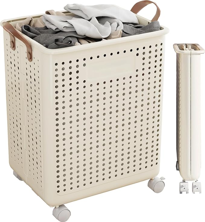 洗濯かご ランドリー バスケット 折り畳み スリム 洗濯カゴ 折りたたみ 洗濯籠 折畳み キャスター付き 取っ手付き 大容量 ランドリーボックス 洗濯物入れ 幅37.7×奥行31×高さ45.4cm クリームイエロー 53L
