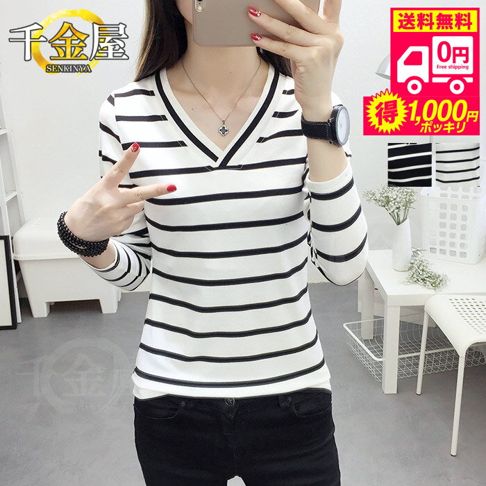 ボーダー カットソー ロンt tシャツ 長袖tシャツ レディース シンプル トップス Tシャツ カットソー ロンT Vネック ボーダー インナー ストレッチ 伸縮性 白 黒 なめらか とろみ ひんやり レディース タイト スリム 買い回りマラソン 1000円ポッキリ 送料無料
