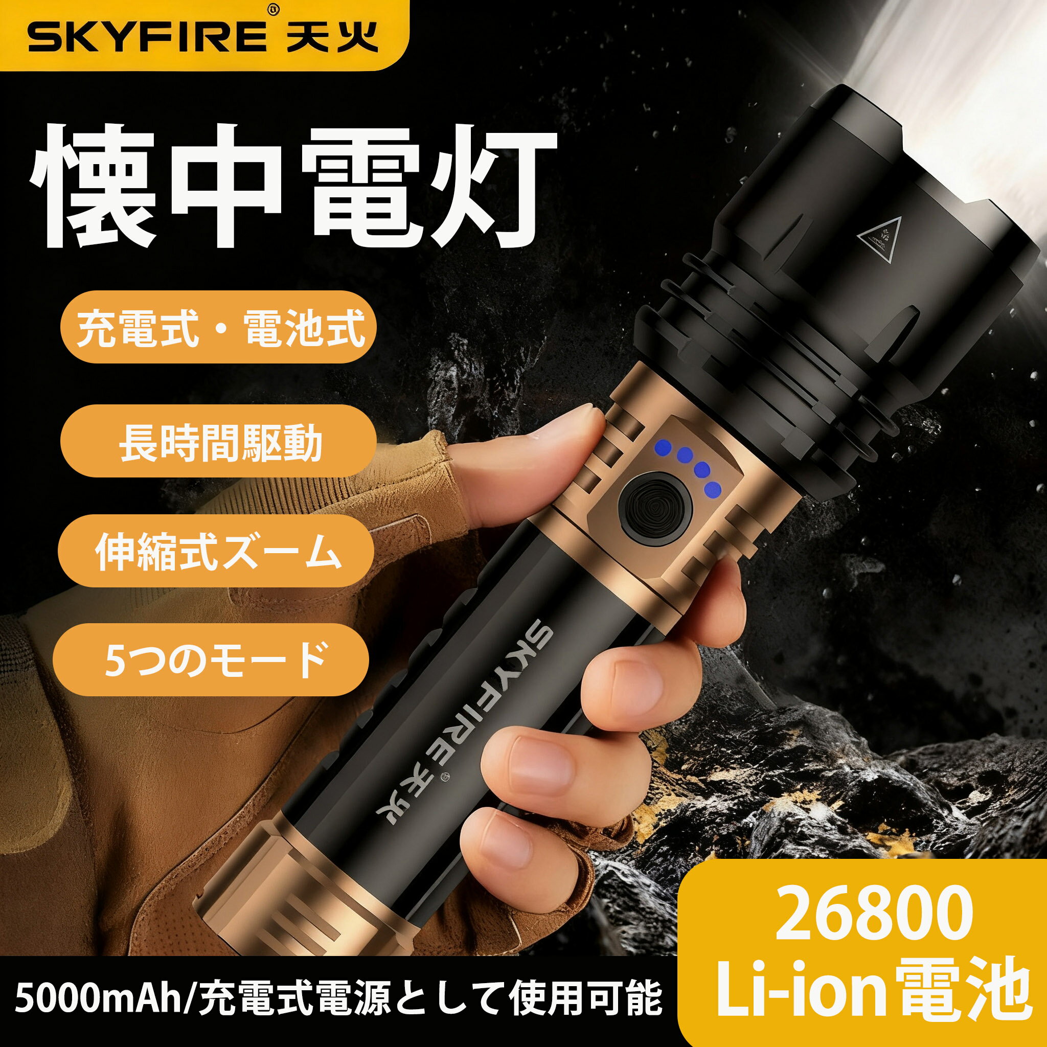 懐中電灯 小型 リチウム電池26800 懐中電灯 充電式 強力 1400LM 5000mAh ハンディライト 最強 大容量 懐中電灯 小型 明るい USB充電式 IP46 防水 高輝度 5モード調光 ズーム式 アルミニウム合金 耐衝撃 残量表示機能 登山 フラッシュライト 夜間 防災
