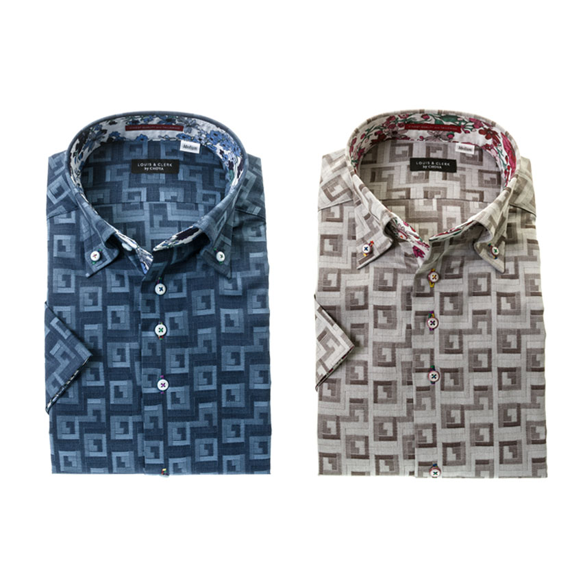 国産 綿100%半袖ドレスシャツ コンフォート ボタンダウン ジャガード織柄 雷紋 幾何柄 ブロック 迷路 白ホワイト 青 グレー ブラウン 胸ポケット無 25FA