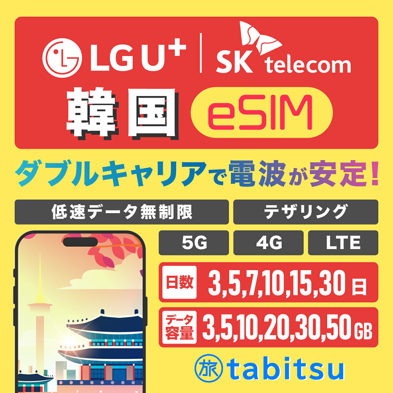 【LG U+ & SKTelecom】韓国eSIM【3日間3GB〜30日間50GBを選べる】 5G/4G-LTE高速データ通信 低速データ無制限 / テザリング プリペイド SIMカード 韓国sim 即時発行 即日発行