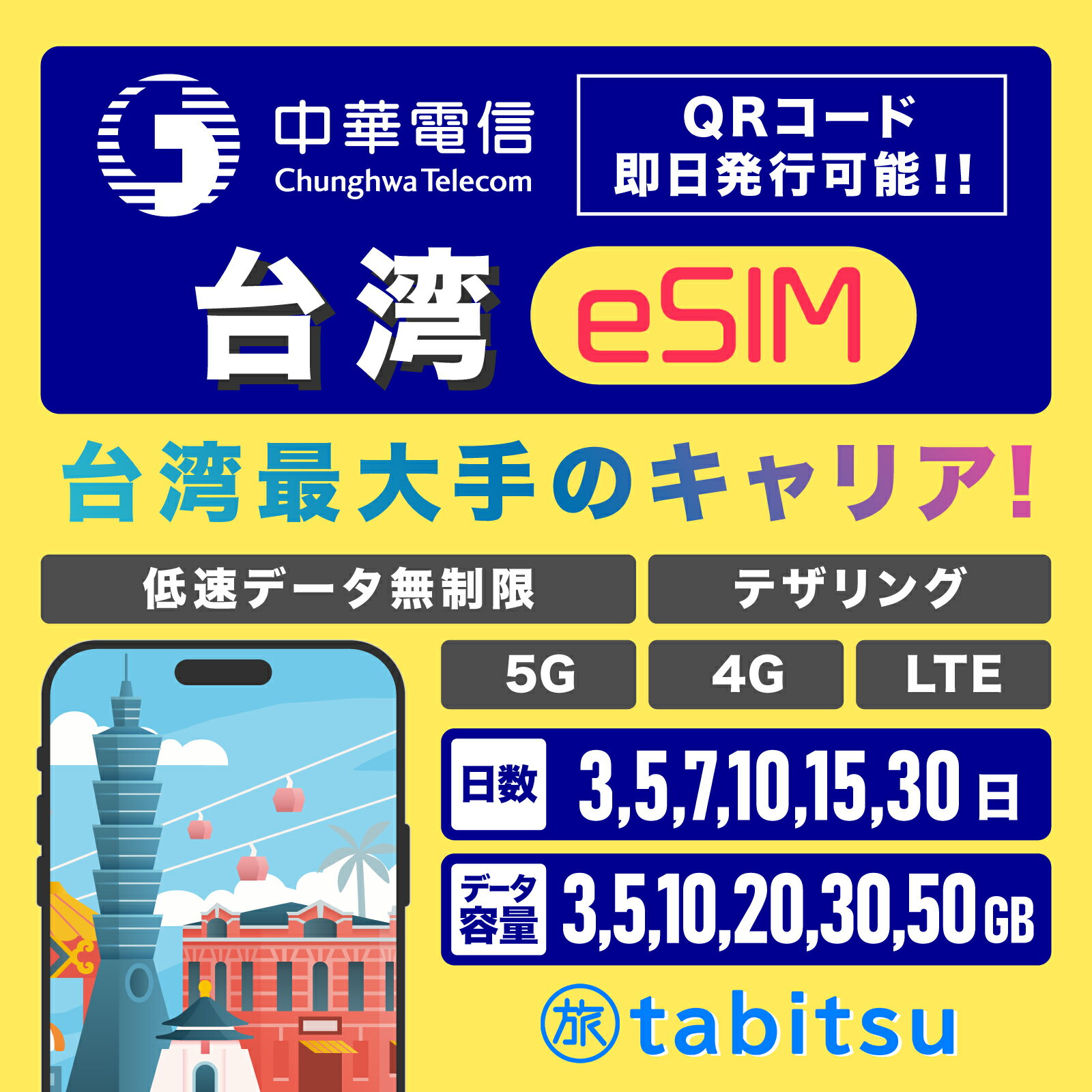 【台湾最大手キャリア使用】台湾eSIM【3日間3GB〜30日間50GBを選べる】 5G/4G-LTE高速データ通信 低速データ無制限 / テザリング プリペイド SIMカード 台湾sim 即時発行 即日発行