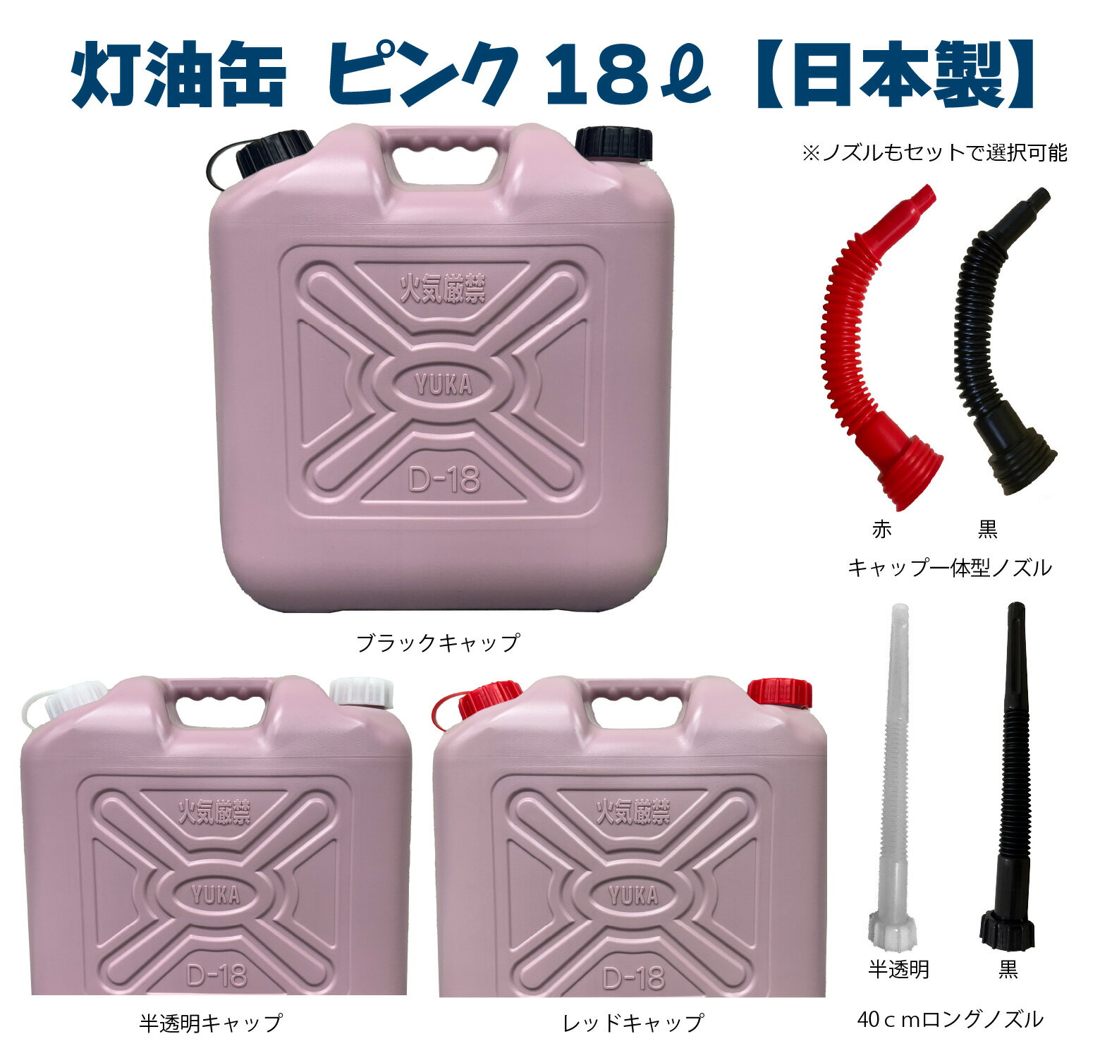 YUKA 灯油缶 18L 本体ピンク 日本製 灯油タンク ポリ缶 ポリ容器 灯油用 アウトドア キャンプ 災害 防災 キャップカラーとノズルの有無が選べます