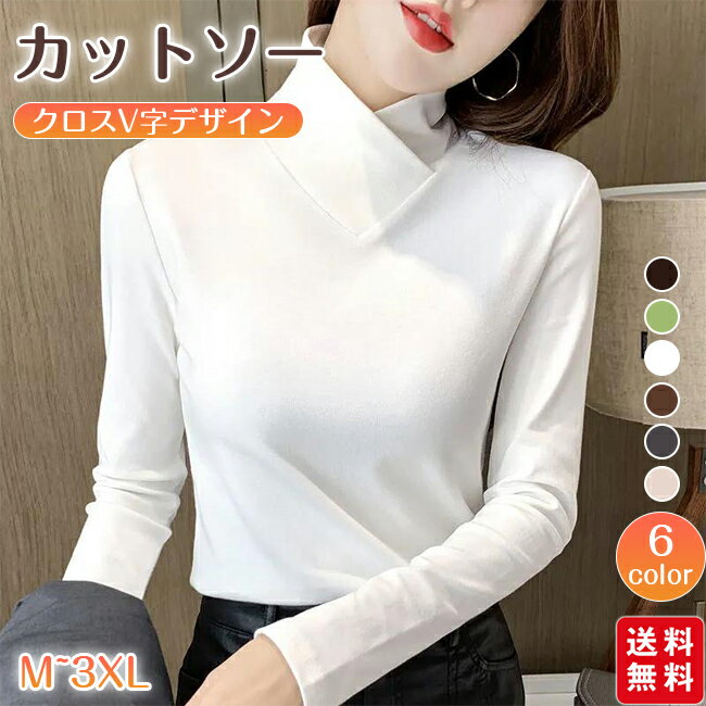 カットソー 両面起毛 長袖 tシャツ ハイネック クロスV字デザイン レディース インナー トップス 肌着 伸縮素材 着心地 裏起毛 無地 きれいめ スリム ストレッチ 秋冬