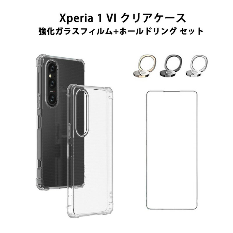 ホールドリング+強化ガラスフィルム付き Xperia 1 VI ケース SO-51E SOG13 XQ-EC44 カバー TPU ソフト 1VI クリアケース 透明 衝撃吸収 ストラップホール ワイヤレス充電対応 Xperia1VI エクスペリア SO51E XQEC44 透明ケース 液晶保護フィルム スマホリング