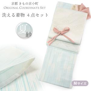 洗える着物 夏きもの 紗 コーディネートセット 4点 M 水色 縞 小紋 名古屋帯 開き仕立て 正絹 帯揚げ 帯締め レディース 和服