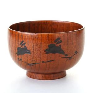 天然木製 子供椀 跳びうさぎ彫り 漆塗り 汁椀
