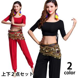 ベリーダンス衣装 レッスンウェア2点セット Tシャツ ゆったりパンツ 大人 黒 赤 ダンス着 ヨガ 伸縮性 シンプル FL71212 [M便 2/3]ストレッチ素材