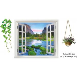 ウォールステッカー 窓 山と河川の風景 鉢植えと花 壁シール 癒される 緑 ブルー 剥がしやすい 自然
