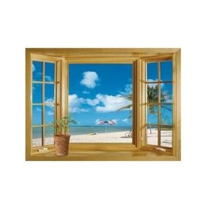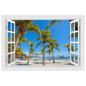 ウォールステッカー 窓枠 ヤシの木とビーチの風景 青空 壁紙シール 開放的 海沿い まるでリゾート地