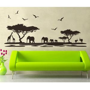 ウォールステッカー 大きい サファリ 黒色 壁シール 象とキリン アフリカの動物 木 サバンナ 模様替え