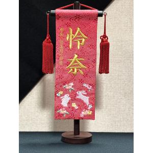 ●送料無料●高級名前旗 命名旗/タペストリー 名物裂 朱色 刺繍 桜うさぎ柄 赤房 女の子 コンパクト特小サイズ 名前+生年月日 書き順通りに刺繍します