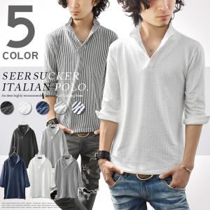 ポロシャツ メンズ シャツ 七分袖 7分袖 シアサッカー 生地 ストライプ 無地 スリム ショート丈 スキッパー カジュアル
