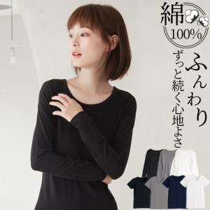 綿 コットン100% レディース カットソー インナー 長袖 暖かい あったか 保暖 静電気防止 半袖 丸首 Vネック 白 ホワイト 黒 ブラック 紺 ネイビー グレー