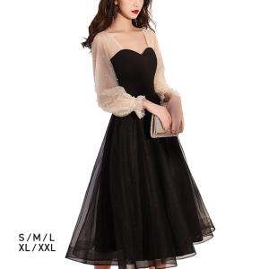 パーティードレス ワンピース ミドル丈 結婚式 二次会 お呼ばれ 忘年会 フォーマル 袖あり 長袖 シースルー袖 ビーズ かわいい 送料無料