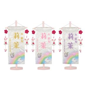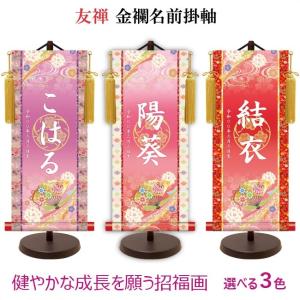 【3柄】名前旗 名入り掛け軸(小:高さ約44.5cm) 友禅 金襴名前掛軸 吉祥金泥梅花紋入 スタンドセット 飾り房付 命名掛軸【女の子】ひな祭り