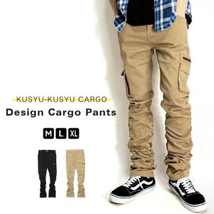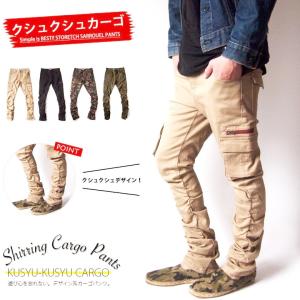 カーゴパンツ スキニー メンズ デザイン モード クシュクシュ ワークパンツ おしゃれ キレイめ スリム ストレッチ ブラック ベージュ 春 夏 秋 冬 M L XL
