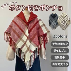 ボタン付きポンチョ 厚手 チェック 格子 羽織り レディース ギャザーポンチョ 暖かい ストール風カーデ ワンマイルウェア