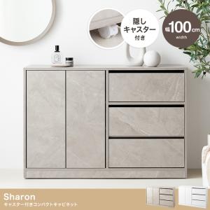 キャビネット 幅100cm 大理石柄 隠しキャスター チェスト 収納 扉付き 棚 可動棚 引き出し付き ホワイト グレー ストーン