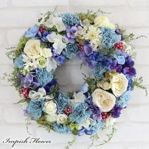造花 リース 玄関 壁掛け フラワーリース あじさい 青 豪華 アートフラワー アレンジ おしゃれ W-1060