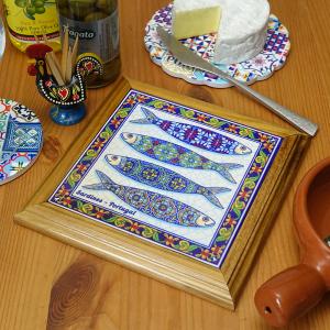 ポルトガル製 ポットプレート 19cm 鍋敷き サーディン イワシ お魚 カラフル 耐熱 壁掛け 絵タイル ウッドフレーム ナベシキ pmc-s6br