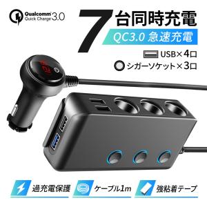 シガーソケット 3連 車 電源 usb 充電 電圧 led ブラック スマホ ケーブル カーチャージャー 携帯 QC3.0 急速 スイッチ 増設 固定 iPhone 省エネ