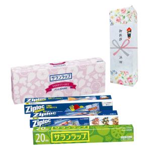 【引越し挨拶 ギフト 名入れシール付き】サランラップバラエティギフト SVG4 ピンクのし包装紙 ジップロックセット 玄関ドアに掛けられる袋付き 粗品 御礼