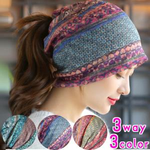 エスニック ニット帽 3way 帽子 ネックウォーマー ヘアバンド ターバン フェイスマスク オールシーズン レディース