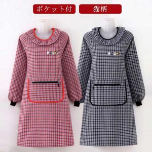 ロング丈 レディース ネコ かっぽうぎ レッド 割烹着 グッズ 猫 猫柄 長袖 エプロン キャット かっぽうぎ ブラック ブラウン ねこ グリーン お