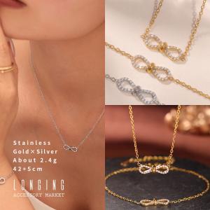 ネックレス ステンレス レディース リボン ゴールド シルバー ジルコニア 42+5cm 18Kコーティング 金属アレルギー対応 Stainless