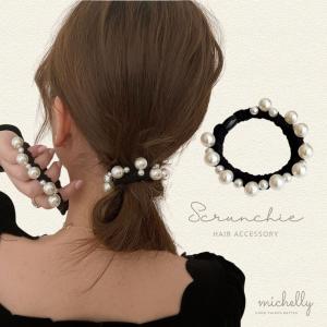 シュシュ パール おしゃれ 黒 ブラック 切れにくい 太め ヘアゴム フォーマル 大人可愛い まとめ髪 ヘアアクセ 上品