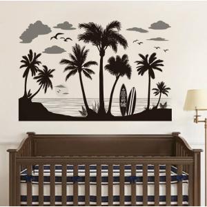 ウォールステッカー ヤシの木とビーチ モノトーン 壁紙シール サーフボード カモメ 南国 海岸 雲 送料無料