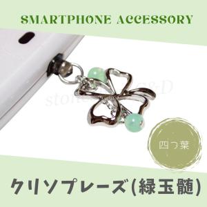 ストラップに変更可★クリソプレーズの四つ葉のクローバーイヤホンジャック 植物 丸 まる iPhone 黄緑 緑 スマホピアス グリーン みどり green
