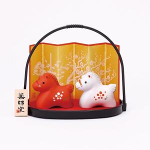 薬師窯 錦彩 招福午(紅白)小手籠付 令和8年 2026 招き午 馬 干支 うま 置物 和縁起物 新年正月 海外プレゼント 贈り物