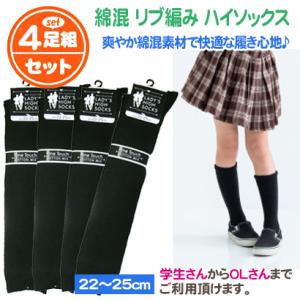 スクールハイソックス 4足セット 綿混 リブ編み 黒 靴下 学生 中高生 OLさん 婦人 子供 シンプル 学校 通学 ブラック 学校 通学 通勤 送料無料 爆買