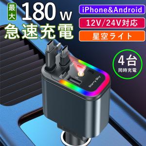 シガーソケット usb 増設 車載 充電器 カーチャージャー180W 急速充電 星空ライト 伸縮ケーブル Type-C Lightning iPhone Android 12V 24V