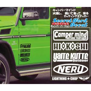 シークレットワードデカール「キャンパーマインド 火起こし 焼いて食って 寝る!」横幅約18cm カッティングステッカー