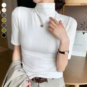 ハイネック tシャツ カットソー 半袖 リブニット トップス タイトフィット 伸縮性 エレガント シンプル 無地 カジュアル オフィス 通勤 春夏 スリム レディース