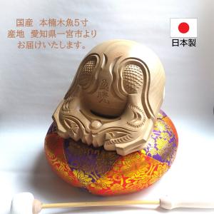 [愛知県製] 木魚 本楠 一式 6号 横幅18cm 6寸 国産 日本製 仏具 お盆 お彼岸 法事 ふとん 座布団 皮巻き籐柄バイ付き セット 高級