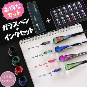 ガラスペン 万年筆 硝子ペン 付けペン 手作り インクボトル付き ペン置き付き 3点セット&12色インクセット 透明