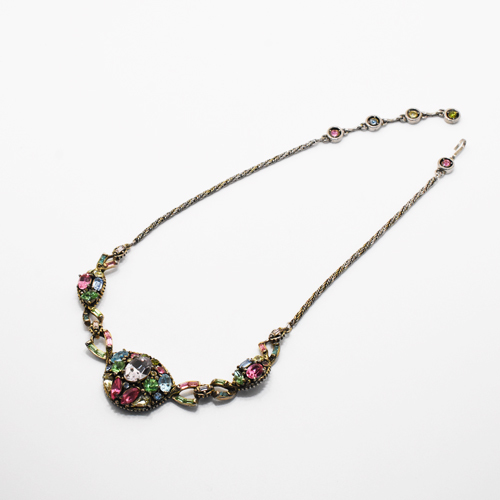 N7893/クリスマスツリーネックレス ステンレス製チェーン使用 カラフルラインストーン 赤 緑 パール 18金ゴールド加工 長め 50cm