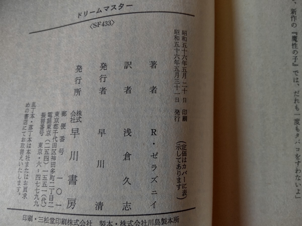 Product name: SF初版2冊/ドリームマスター ネビュラ賞 燃えつきた橋 ロジャー・ゼラズニイ ハヤカワ文庫 浅倉久志 深町真理子 早川書房