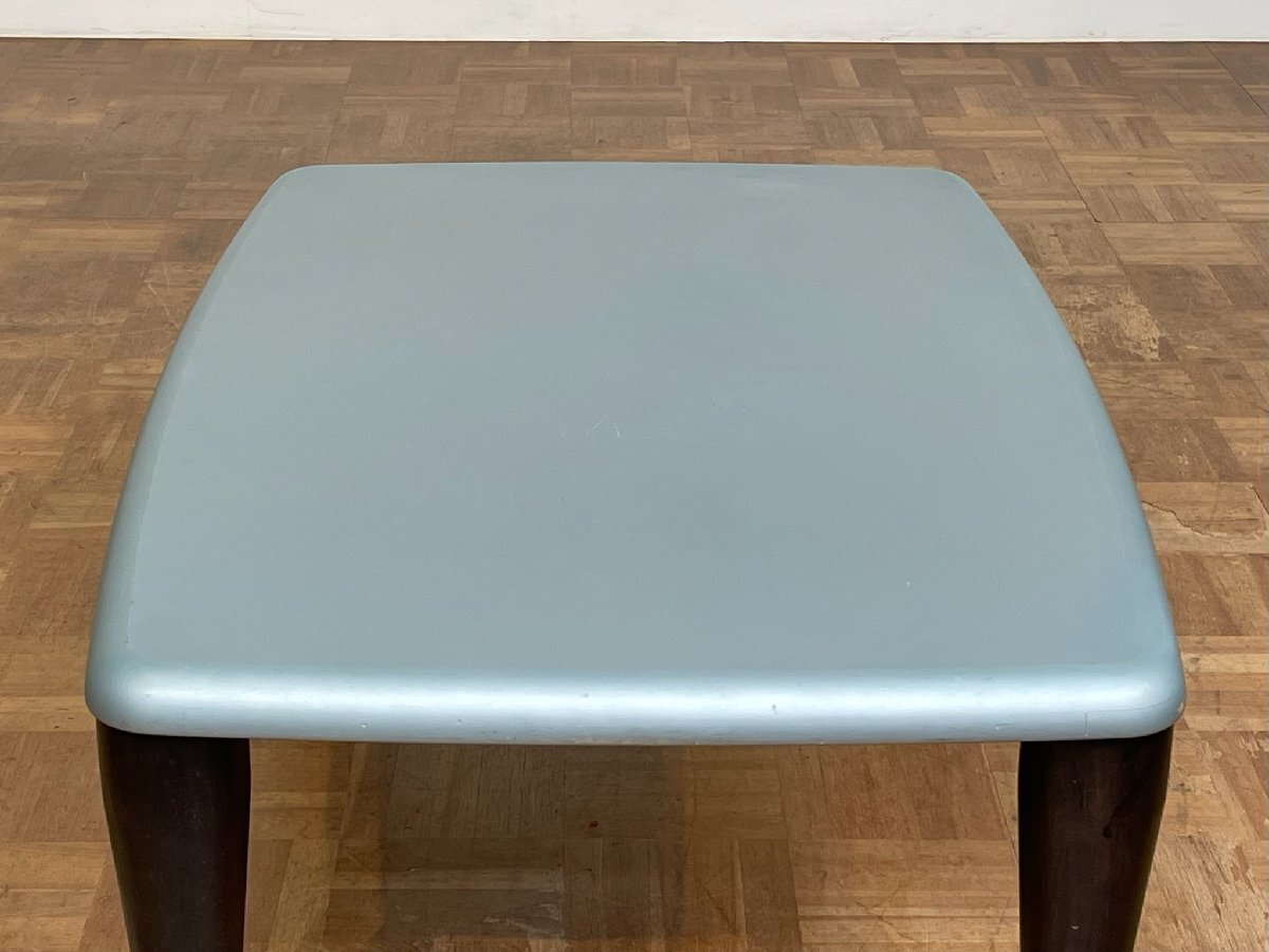 テーブルトップの四辺と四角、各辺やエッジと全方位にわたって重力の緩みを感じさせるようなアールの丸みを強調する美しいシルエットと、細やかなシボ打ちとマットな光沢感の美しい塗装仕上げのカラーリングと質感がポストモダンデザイン時代を象徴するクリエイション。