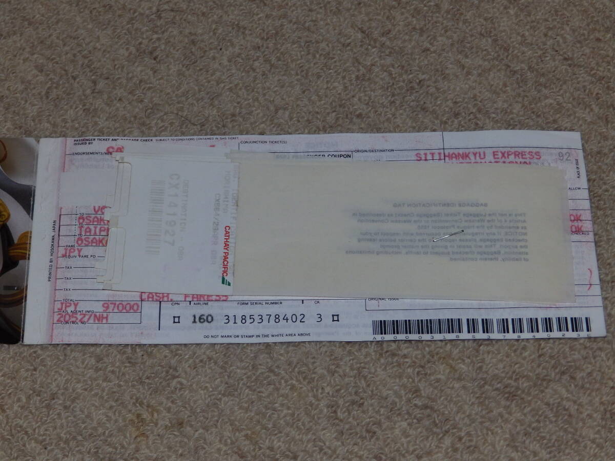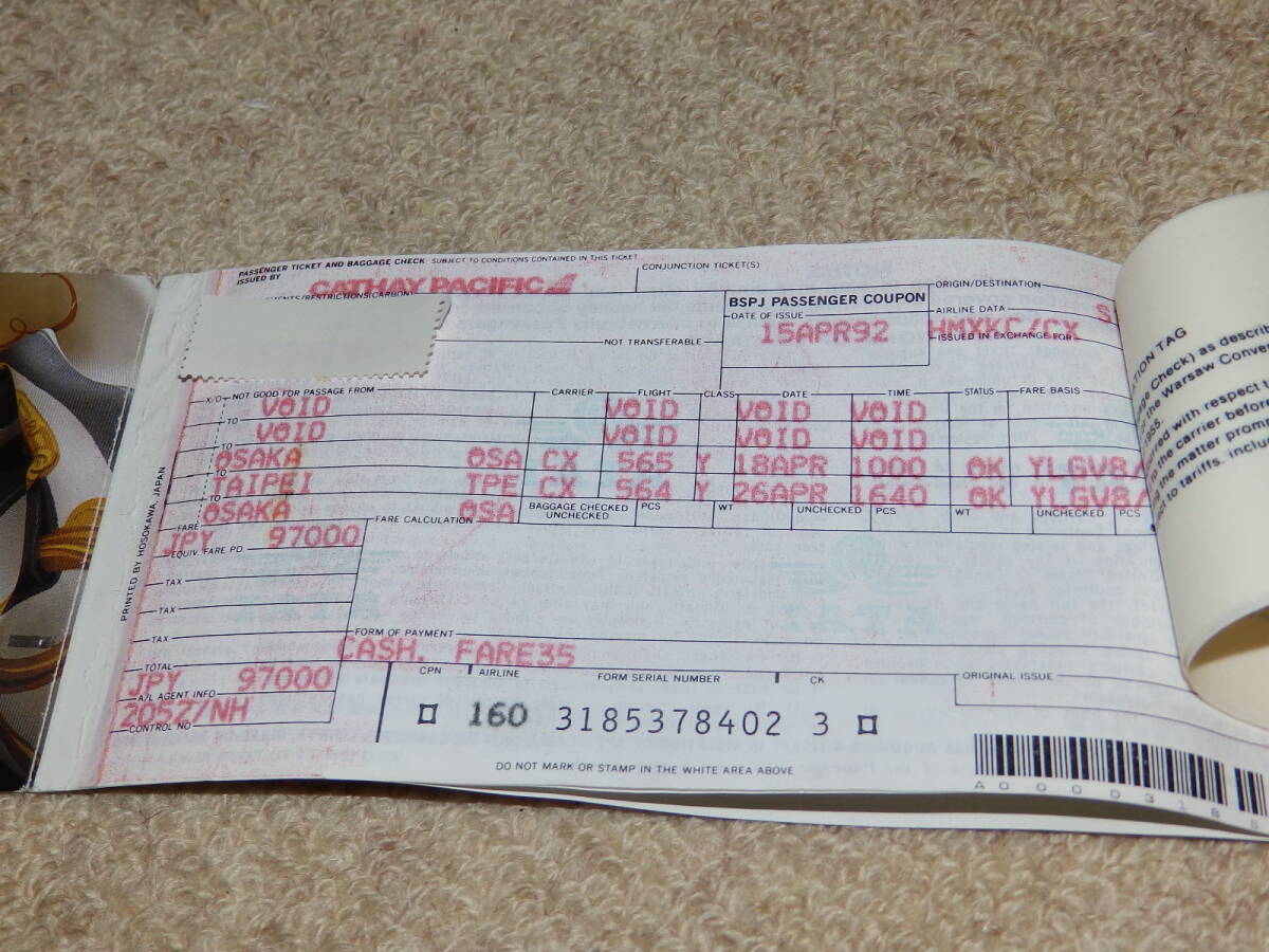 キャセイ航空 使用済航空券チケット 伊丹→台北、台北→伊丹 1992年4月15日発行 手荷物タグ合計5枚付き