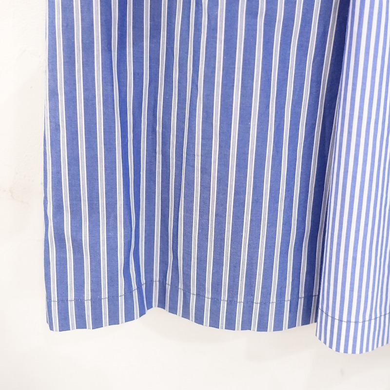 NATURAL LAUNDRYのストライプ切り替えギャザースカートです。カラーはブルー、ホワイトのストライプで、3種類のストライプの切り替えデザインです。コットンの布帛地で仕立てられています。ウエストはゴム仕様に、ひもが通っており調整可能です。肩ひもは長さ調整可能で、両サイドにシームポケット付きです。定価(メーカー希望小売価格) 12,100円の商品です。