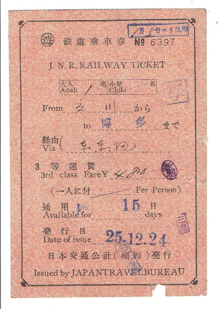 Product name: 《鉄道乗車券》昭和25年 日本交通公社・福岡
