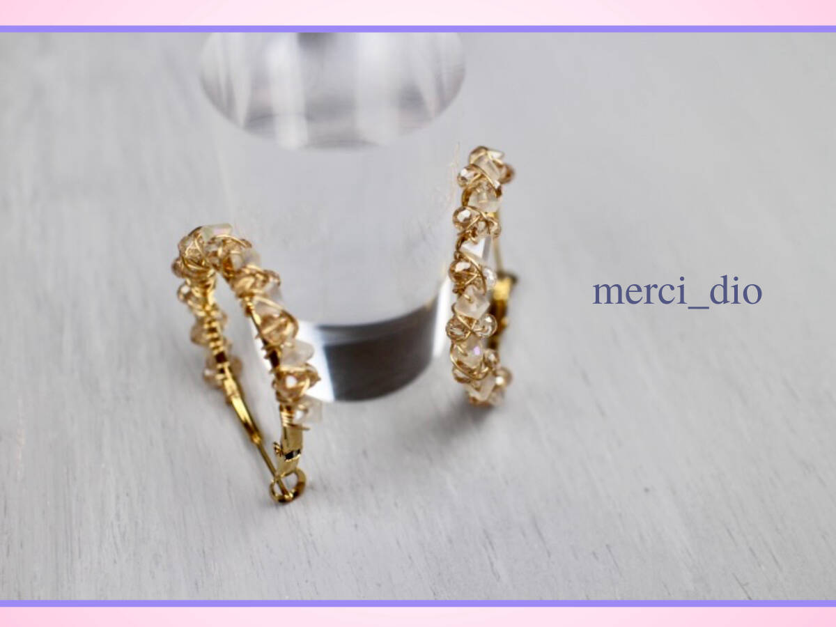 ナチュラルなアースカラーの透明感の高いストーンビーズが装飾されたフープピアスです。ミディアムサイズのゴールドカラーのフープにイビツな乳白色のストーンと透明感のあるコーラルオレンジのビーズをランダムに装飾。全体的に淡いナチュラルなアースカラーが女性らしいピアスです。トーンを合わせたカラーコントラストがスタイリングを選ばず合わせられるおすすめのフープピアスです。