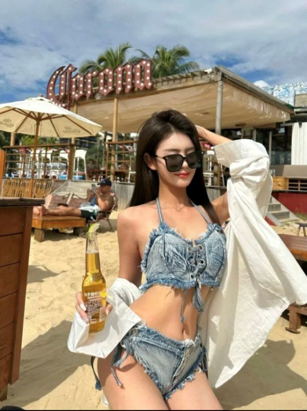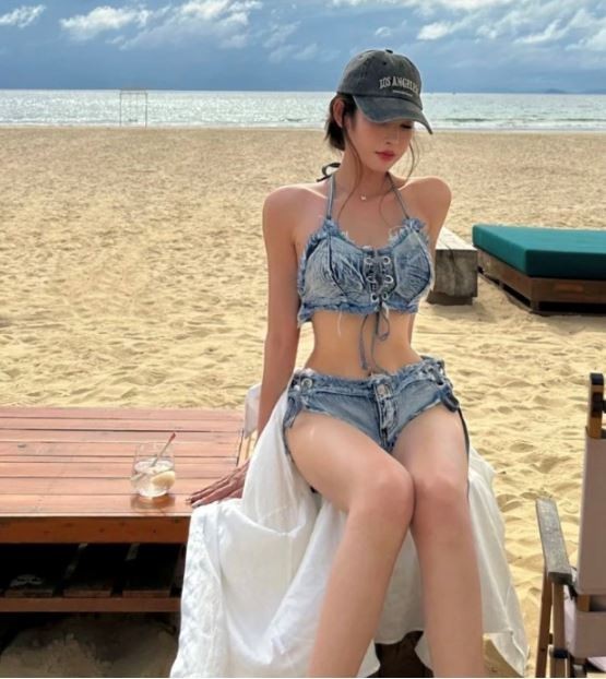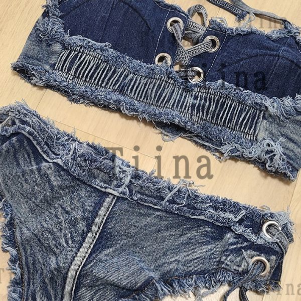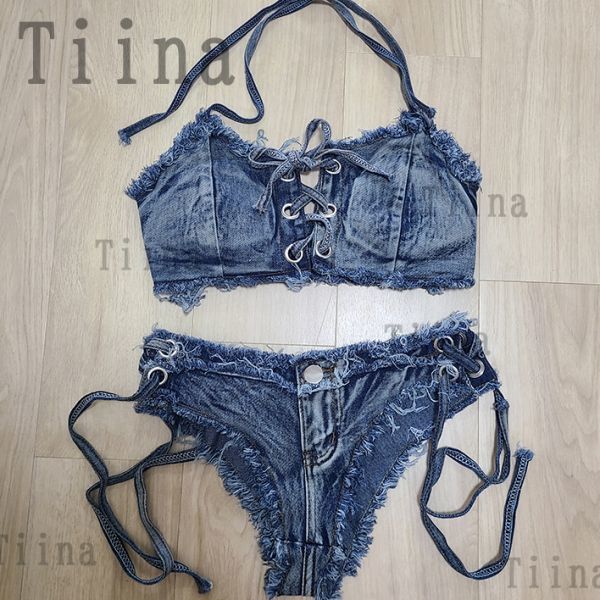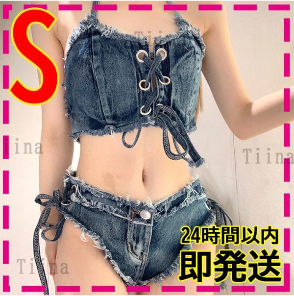 S デニム 編み上げ ブラジリアンビキニ ギャル 水着 ブルー バンドゥ ホルター インディゴ 韓国
