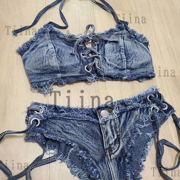 Product name: S デニム 編み上げ ブラジリアンビキニ ギャル 水着 ブルー バンドゥ ホルター インディゴ 韓国